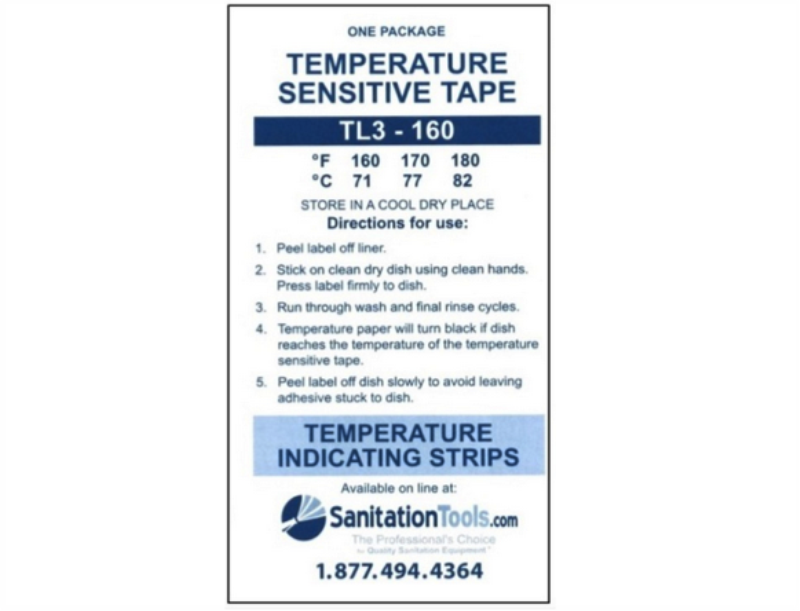 One package of (16) 160F/170F/180F temperature sensitive tapes for use in determining the surface temperature of items being washed. Tape turns black if surface being tested reaches 160F, 170F, or 180F. Use to verify final rinse temperatures in your cage, rack, tunnel, and bottle washers.