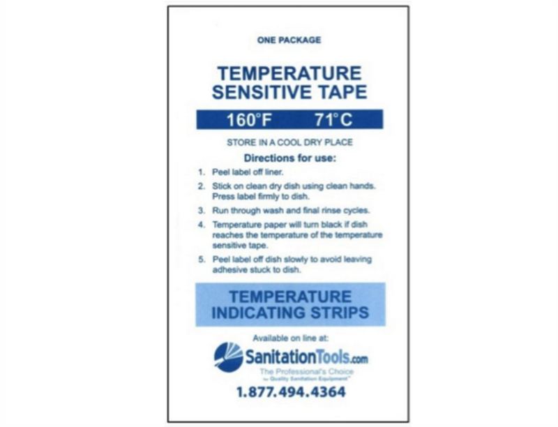 One package of (24) 160F temperature sensitive tapes for use in determining the surface temperature of items being washed. Tape turns black if surface being tested reaches 160F. Use to verify wash temperatures in your dish, cage, rack, tunnel, and bottle washers.