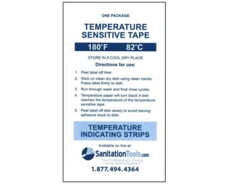 One package of (24) 180F temperature sensitive tapes for use in determining the surface temperature of items being washed. Tape turns black if surface being tested reaches 180F. Use to verify final rinse temperatures in your cage, rack, tunnel, and bottle washers.