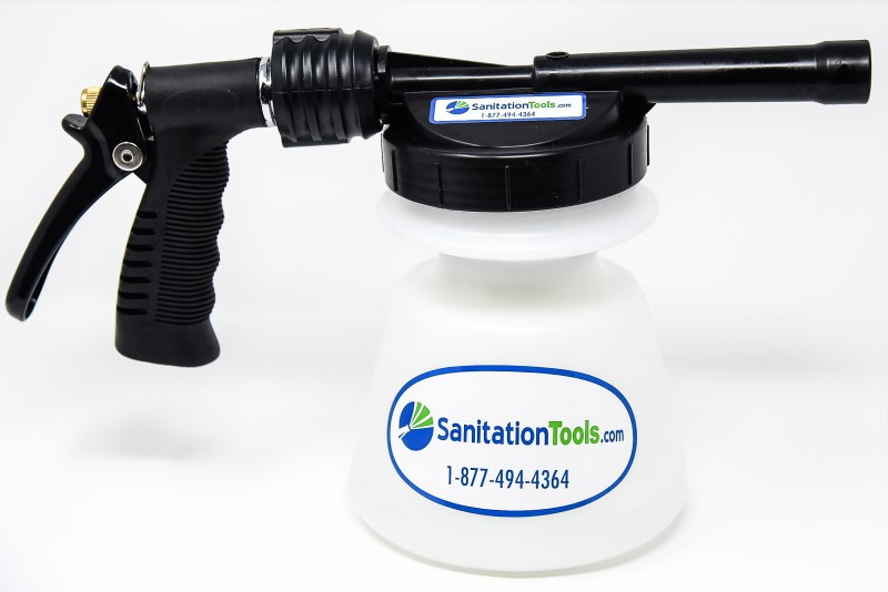 HydroFoamer 483 hose end proportioners combine automatic dilution with convenient control of where and how solution is applied. The HydroFoamer 483 provides a thick, rich foam for more "cling" time on the surface being cleaned. The HydroFoamer 483 provides an excellent way to apply cleaners/sanitizers/disinfectants at metered dilutions. On and off functions are controlled using a trigger on the spray gun. To rinse, the concentrate container is disconnected via a quick coupler.