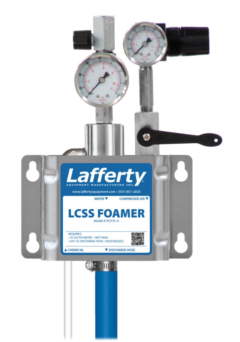 The LCSS Foamer With Gauges is a medium volume foam applicator for projecting foaming chemicals on to any surface up close or at a distance. This stainless steel venturi injection system uses standard city water pressure (35 - 125 PSI) to draw and blend chemical concentrate into the water stream to create an accurately diluted solution. Rich, clinging foam is created by injecting compressed air into the solution to greatly increase volume and coverage ability. The foam is then projected through the discharge hose and fan nozzle at distances up to 12 feet. Gauges display incoming water and air pressure.
